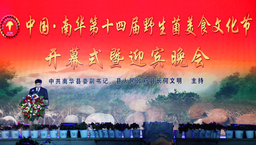 县委书记李云升在开幕式上致辞,他指出,绿色是南华的底色,生态是南华的优势,南华山水灵秀、人杰地灵、风情浓郁,具有悠久的历史文化和民族文化,享有“九府通衢地”、世界“野生菌王国”、“中国野生菌之乡”、“中国野生菌美食县”、“中国核桃之乡”等美誉,是国家“一带一路”通往南亚、东南亚的咽喉要塞,是长江经济带、孟中印缅经济走廊的重要通道。近年来,南华县借力发力,始终坚持绿色发展,厚植发展优势,深入实施“产业富民、工业强县”战略,把野生菌产业作为产业转型升级的重要载体,展示生态文明建设的重要窗口,推动群众脱贫致富的重要抓手,取得了明显成效,2016年,全县野生食用菌集散交易量达7670多吨,交易额5亿多元。