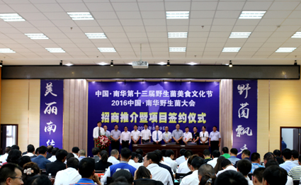 8月9日下午,中国•南华第十三届野生菌美食文化节2016中国·南华野生菌大会招商推介暨项目签约仪式在南华县公务中心举行,现场进行了南华县招商引资联络处授牌仪式以及招商引资项目签约仪式。通过前期的广泛接触和洽谈,已达成签订正式合作协议项目10个,投资服务协议项目30个。