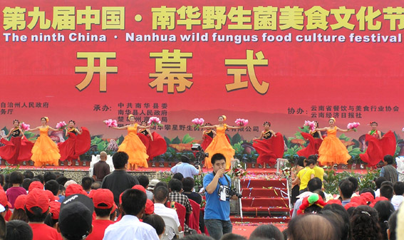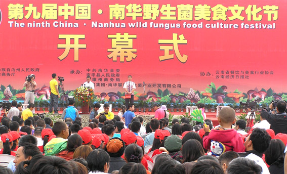 2012年8月9日上午,第九届中国·南华野生菌美食文化节在县城开幕。南华县城处处张灯结彩,弥漫着浓浓的节日气息。上午九点,龙泉广场人山人海,第九届中国·南华野生菌美食文化节拉开帷幕。中共南华县委副书记、县人民政府县长冯毅主持了开幕式。首先,中共南华县委书记陆积峰致开幕词,陆书记说:本届野生菌美食文化节将以“魅力菌王国、美食扬天下”为主题,突出南华县区位、资源、产业优势,以节会为载体,展示南华新形象,扩大对外开放合作,进一步提升 “九府通衢地”、“野生菌王国”、“生态美食城”三大品牌,促进野生食用菌、生态美食等特色产业提速发展,加速野生菌王国·物流加工出口基地项目建设,培强做大重点产业,丰富城乡群众文化生活,为全县经济社会又好又快发展增添活力,营造全县上下凝心聚力谋发展、万众同心建和谐的良好氛围。