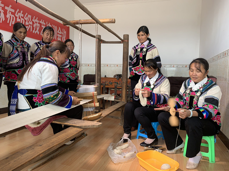 火草麻布纺织技艺演示现场,引来游客驻足观赏。织草成褂的非遗火草麻布纺织技艺,充分展现了彝族群众的勤劳和智慧,并以“师傅带徒弟”的形式,让此项非遗技艺在五街代代相传。