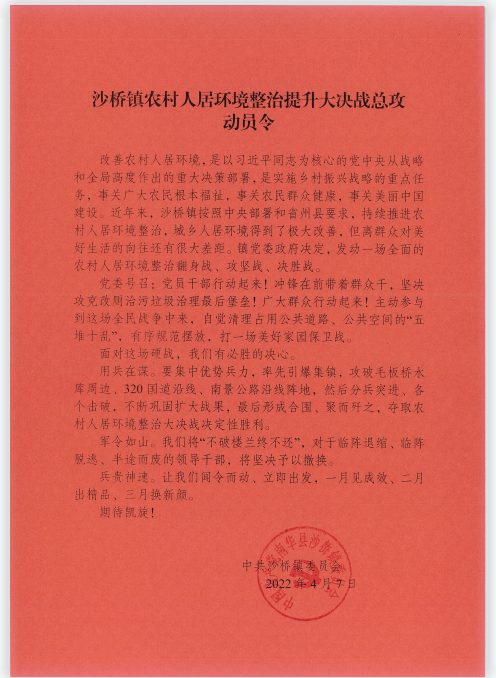 4月11日沙桥镇农村人居环境整治提升大决战总攻以来,我们清醒认识,实现人居环境常治长治,关键在基层治理,重点在建立机制,难点在思想转变,根本在广大群众。大决战总攻,贵在用兵,核心在谋。要通过“113338810105”工作法,确保沙桥镇农村人居环境整治提升大决战总攻取得全面胜利。