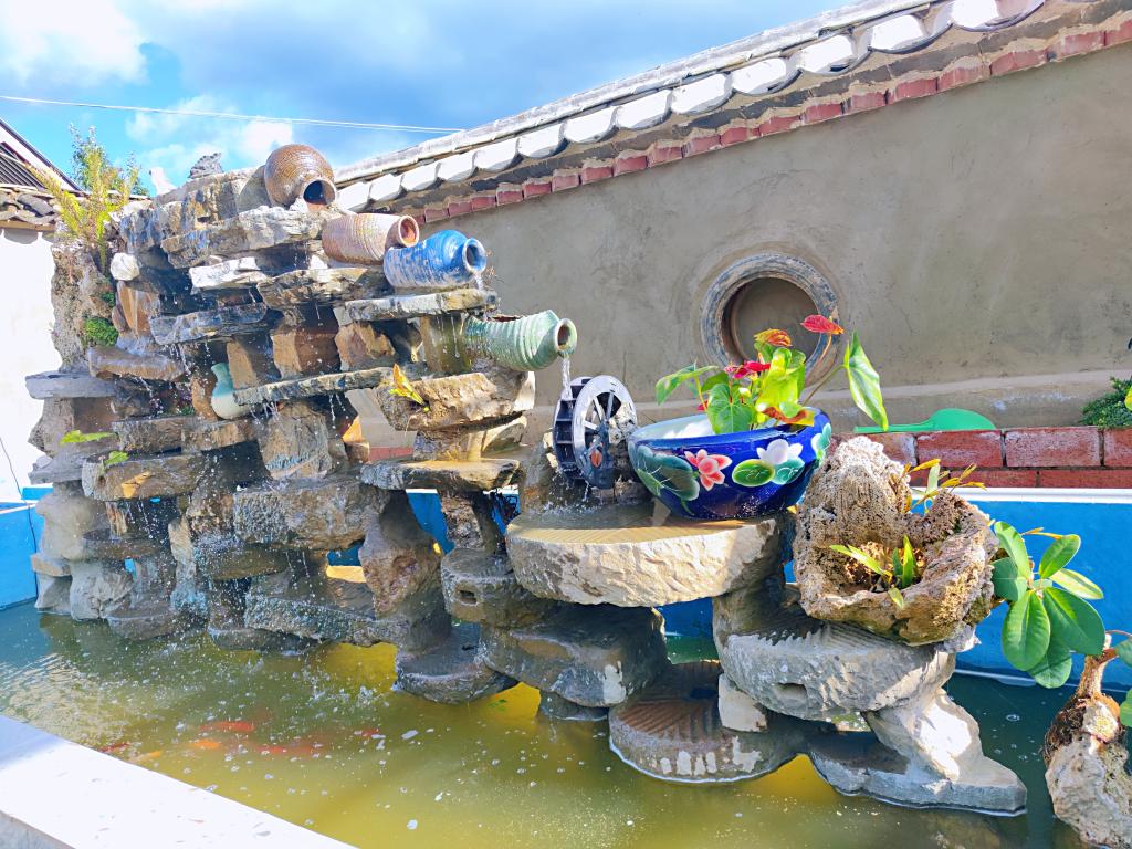 来到背阴村罗荣华家门口,首先映入眼帘的是一棵硕果累累的梨树,走进庭院,随处可见盆景绿植,右侧的假山,是由河中的石头、废弃的瓷器堆砌而成,潺潺流水,峰峦叠嶂,好有气势,宛如站立的勇士,守护着一家人的平安,水池中的鱼儿快乐的游来游去,将整个家点缀得生机勃勃。废弃的轮胎和各种花草,将墙面装点的别有洞天,放眼望去,整个院子清幽雅致。