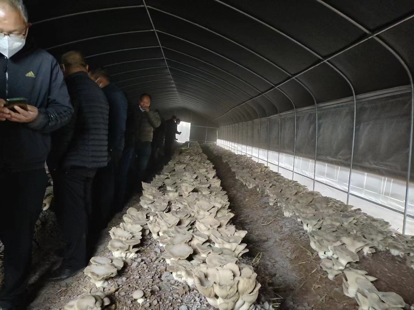 与会人员首先观摩了田心村委会楚雄辛巴汉人工食用菌种植基地,通过基地负责人介绍,学习食用菌种植流程及技术,了解食用菌销售市场,增强村委会干部及农户发展食用菌种植的信心。