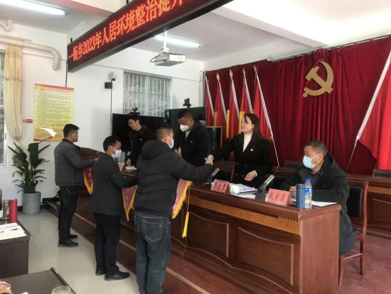 现场观摩结束后,紧接着召开推进会议。会上通报了一街乡2022年第四季度人居环境整治提升考核结果,为考核结果排1-3名的村委会授予红旗,对排4-10名的村委会授予蓝旗,对排11-12名的村委会授予黑旗。被授予黑旗的2个村党总支书记上台作表态发言,并提出下步整改措施。会议宣读了《关于兑现2022年农村人居环境整治提升奖补资金的通知》,对12个村委会给予30000元资金奖励作为人居环境整治提升工作经费。