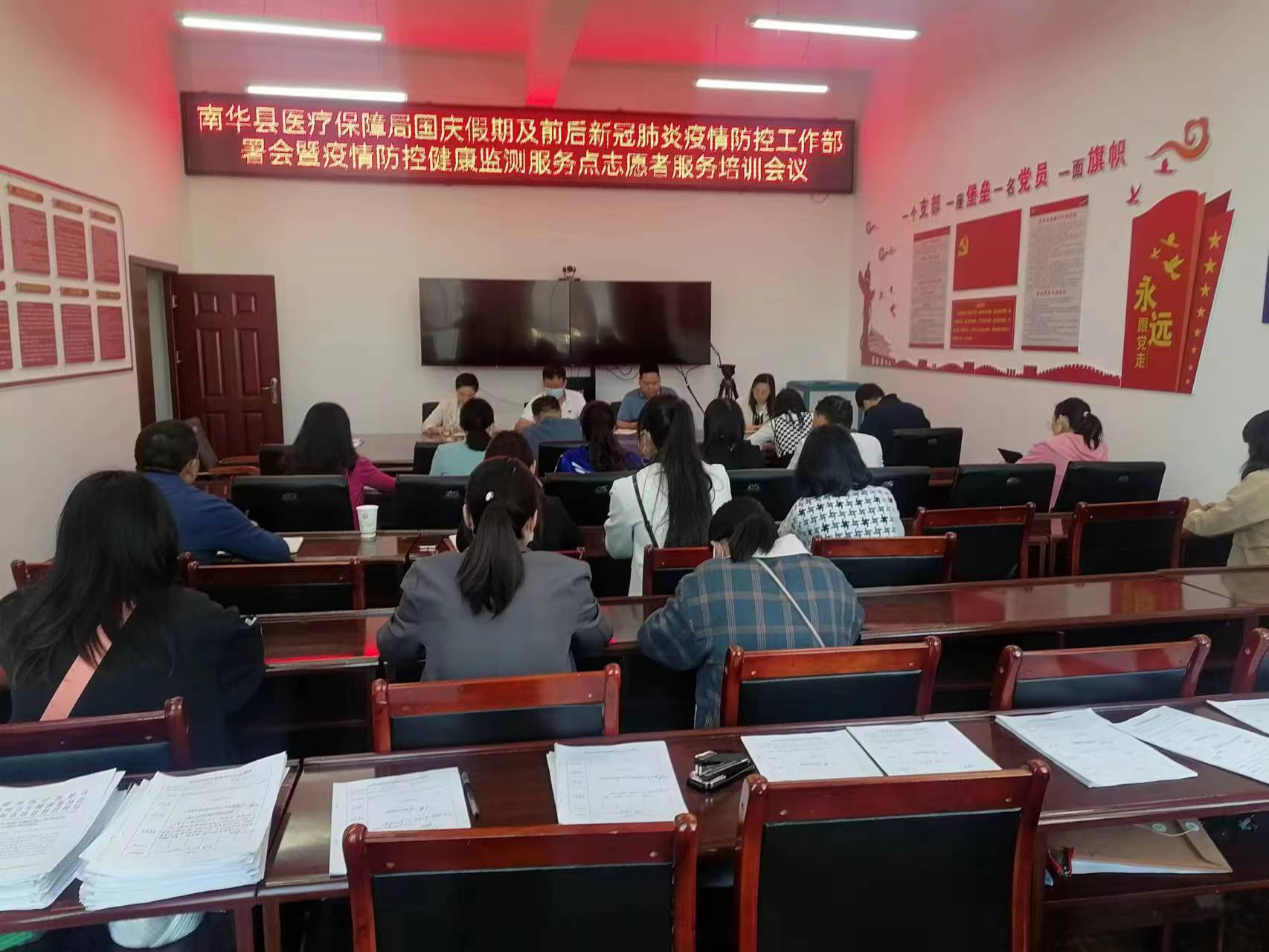为深入贯彻习近平总书记关于疫情防控的重要指示,落实党中央、国务院决策部署,严格执行第九版防控方案,突出外防输入、人员有序流动、重点场所的防控,立足于早、立足于防,早发现、快处置、防外溢,牢牢守住不发生规模性疫情的底线,高效统筹疫情防控和经济社会发展,落实好“疫情要防住、经济要稳住、发展要安全”的要求,以实际行动迎接党的二十大胜利召开。2022年9月19日上午,南华县医疗保障局召开国庆假期及前后新冠肺炎疫情防控工作部署会暨疫情防控健康监测服务点志愿者服务工作培训会议。