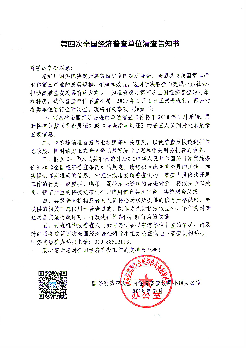 您好!国务院决定开展第四次全国经济普查,全面反映我国第二产业和第三产业的发展规模、布局和效益,这对于决胜全面建成小康社会、推动高质量发展具有重大意义。为准确确定第四次全国经济普查的对象和种类,确保普查单位不重不漏,2019年1月1日正式普查前,需要对各类单位进行全面清查。现将有关事项告知如下:
