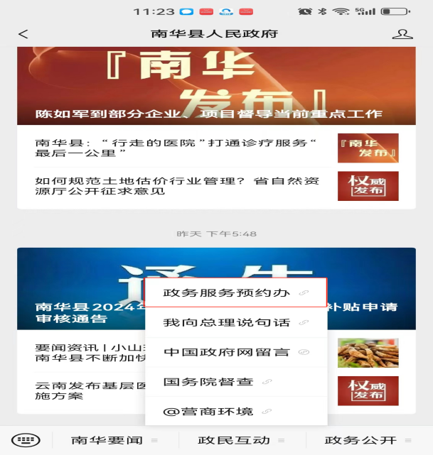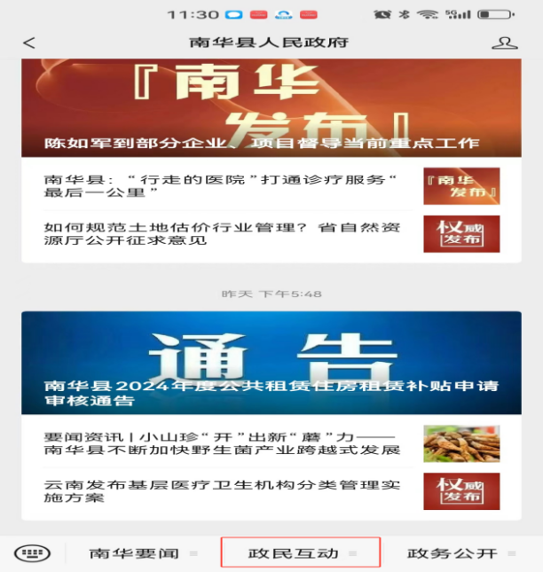 1.打开微信,搜索“南华县人民政府”微信公众号并关注。