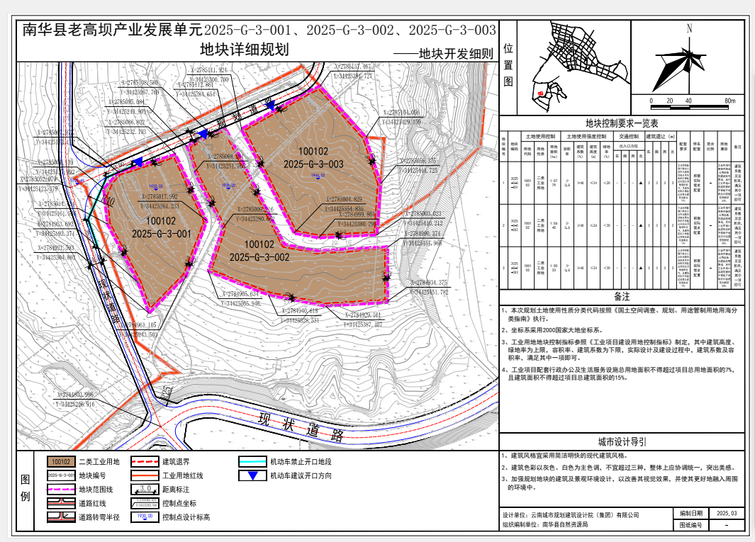 2025-G-3-003主要经济技术指标:项目位于南华县中心城区南部,南华工业园区老高坝片区内西侧。拟用地面积15033平方米,规划用地性质为二类工业用地(100102)。拟核定规划条件主要指标:容积率大于等于0.8,建筑密度(系数)大于等于40%(建筑系数及容积率满足其中一项即可),绿地率小于20%,建筑高度不大于24米。