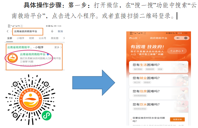 云南省“政府救助平台”已于2021年7月正式上线运行,目前群众可以在线申请的事项有生活困难(临时救助、特困供养、低保)、就业困难(找工作、找培训)、住房困难(农村危房改造)、饮水困难(农村饮水安全)、教育困难(控辍保学)、医疗困难(异地就医未报销、参保登记、大病救助、医疗机构查询、慢病健康管理、大病专项救助)等六个事项14个小项,涉及民政局、人力资源和社会保障局、住房城乡建设局、水务局、教育体育局、卫生健康局、医疗保障局七个部门。有需求的困难群众可以通过微信扫描二维码或者使用微信搜索小程序“云南省政府救助平台”,上线申请救助,具体按平台提示操作。