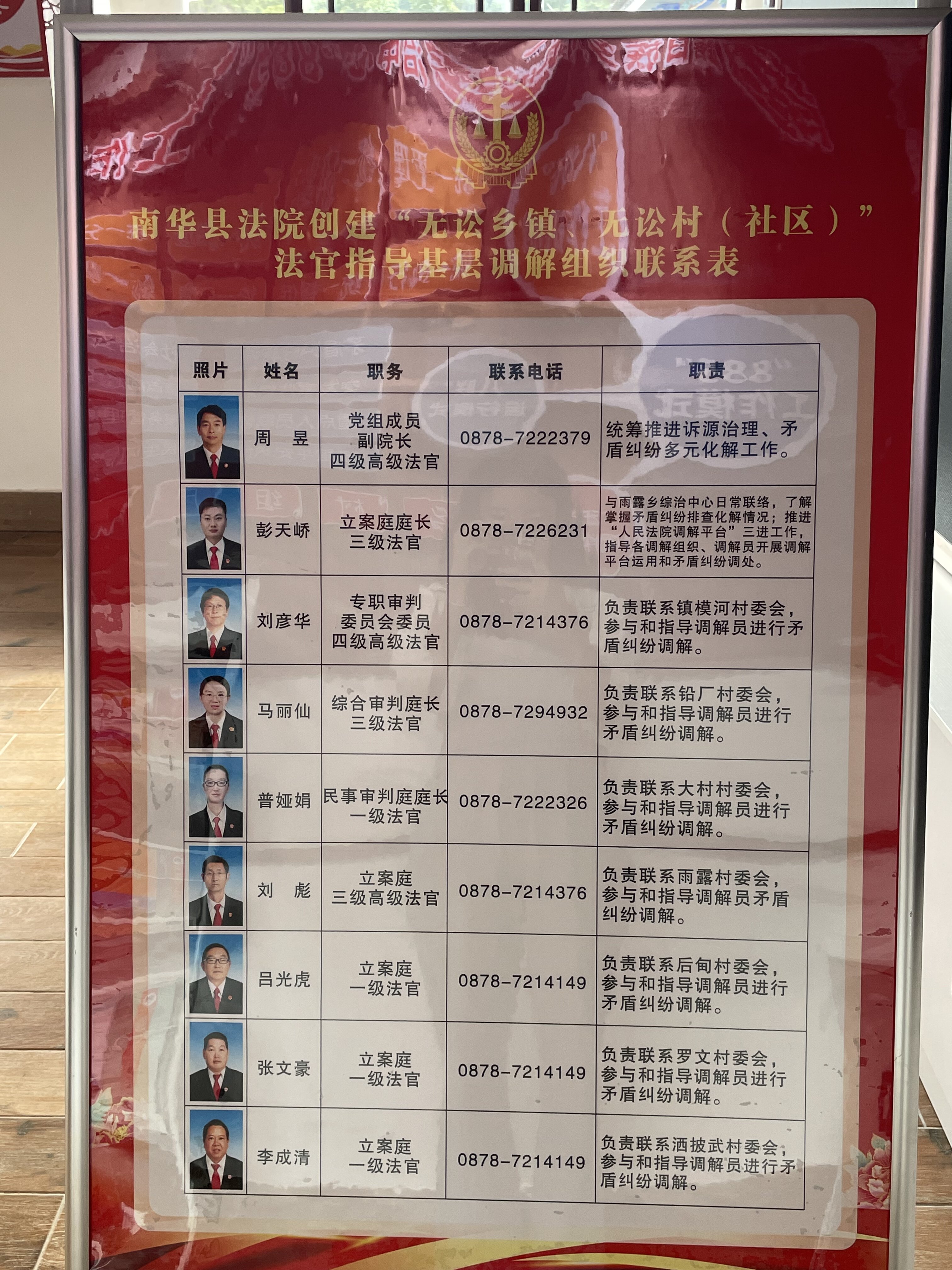 一对一服务,突显“专一性”。一名法官挂点联系1个行政村,分管领导带领法官及时与村委会对接,公布包村联系法官名单,实现行7个行政村全覆盖,公布联系法官的姓名、职务、联系方式、工作职责等。