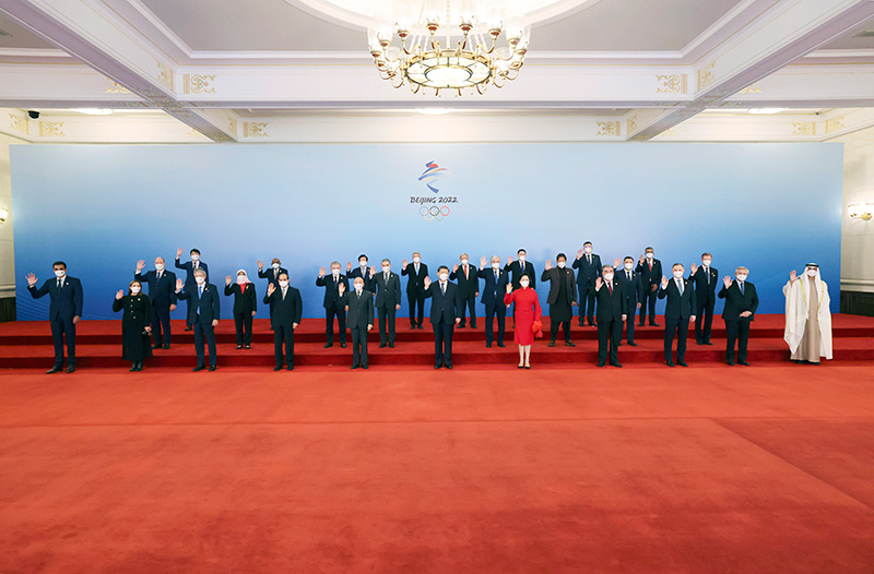 2月5日中午,国家主席习近平和夫人彭丽媛在北京人民大会堂金色大厅举行宴会,欢迎出席北京2022年冬奥会开幕式的国际贵宾。这是习近平和彭丽媛同国际贵宾一起合影留念。新华社记者 谢环驰 摄