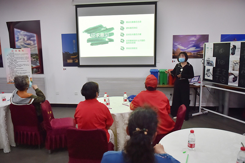 在北京建国门街道赵家楼社区议事厅举行的“两桶一袋”居民征求意见恳谈会上,来自社区的12位垃圾分类达人对“两桶”款式进行投票选择,同时,街道针对桶站位置、定时定点投放等垃圾分类运营管理听取居民意见(2020年5月2日摄)。新华社记者 彭子洋 摄