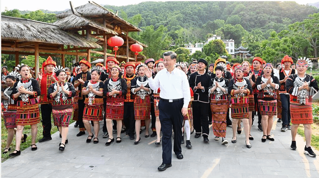 村广场上,竹竿舞节奏欢快,鼻箫婉转悠扬,一片树叶也成了乐器,宛若天籁。习近平总书记感叹:“生活在大自然里,融为一体了。”
