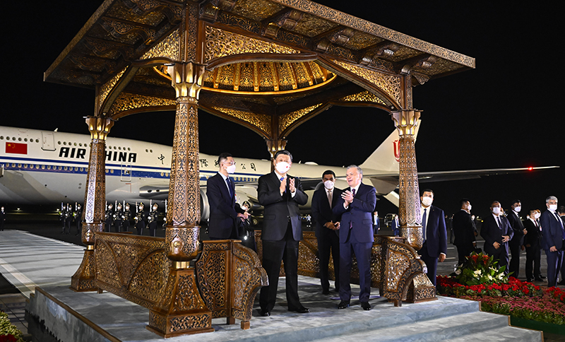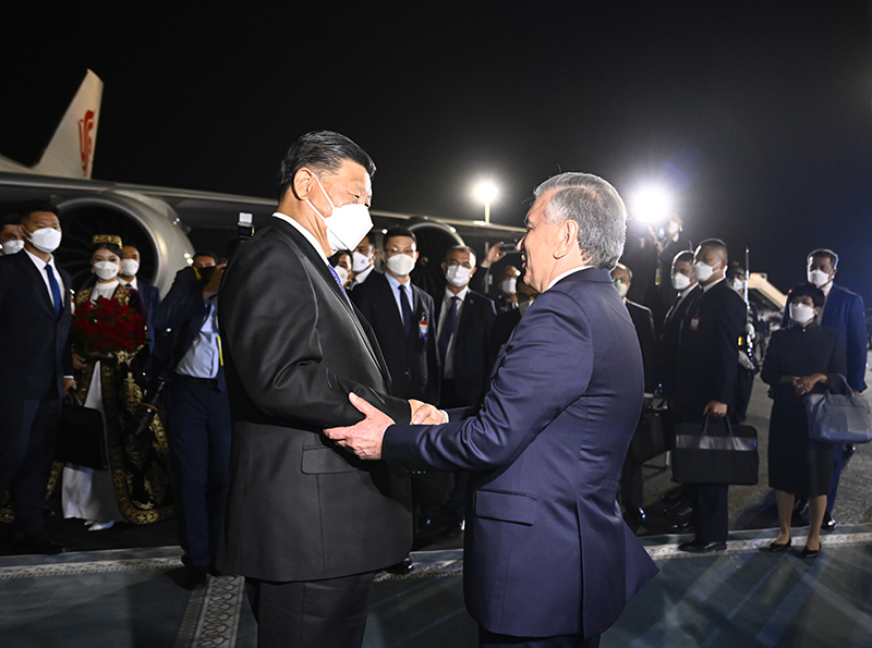 当地时间9月14日晚,国家主席习近平乘专机抵达撒马尔罕,开始对乌兹别克斯坦共和国进行国事访问并出席上海合作组织成员国元首理事会第二十二次会议。这是乌兹别克斯坦总统米尔济约耶夫、政府总理阿里波夫、外长诺罗夫、撒马尔罕州州长图尔济莫夫等高级官员在机场热情迎接。新华社记者 鞠鹏 摄