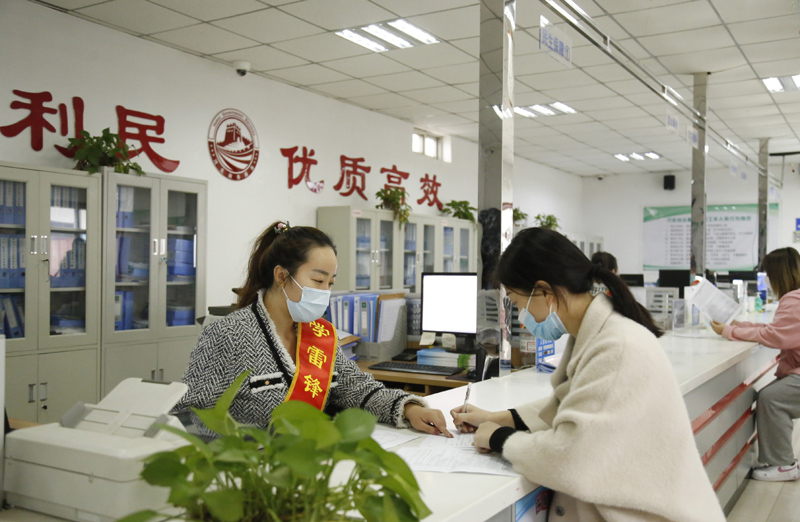 河北省邢台市襄都区宴家屯镇综合服务中心工作人员协助办事群众填写相关表格(2022年3月30日摄)。