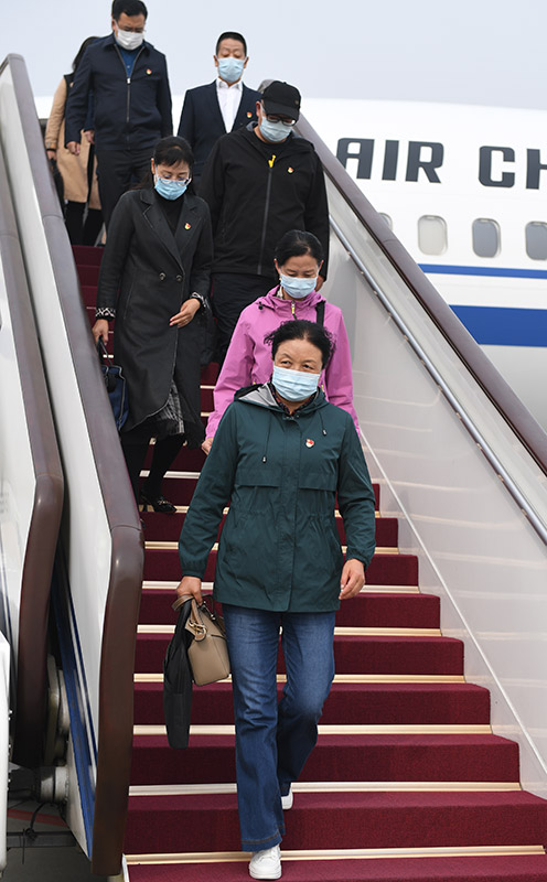 10月13日,来自青海省的党的二十大代表乘飞机抵达北京首都国际机场。新华社记者 张豪夫 摄