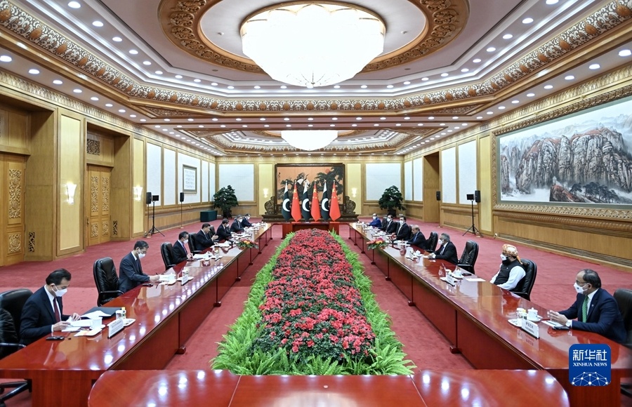 11月2日上午,国家主席习近平在北京人民大会堂会见来华进行正式访问的巴基斯坦总理夏巴兹。新华社记者 姚大伟 摄