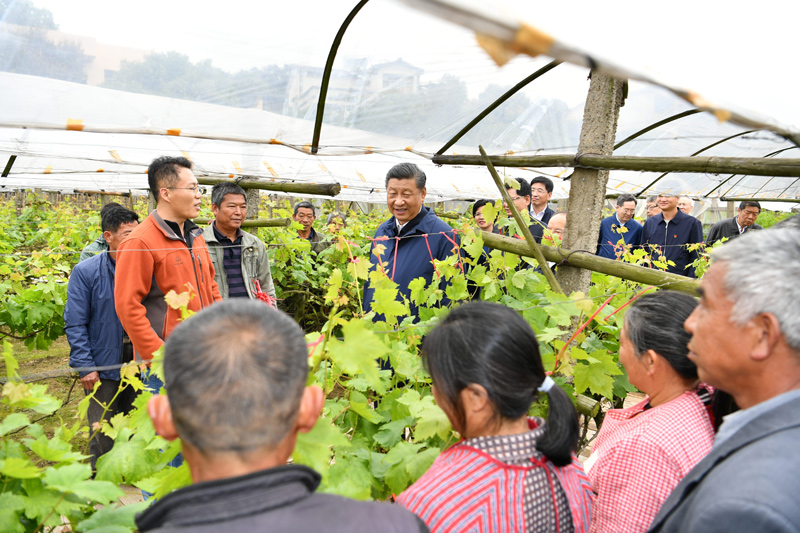 4月25日至27日,中共中央总书记、国家主席、中央军委主席习近平在广西考察。这是25日上午,习近平在桂林市全州县才湾镇毛竹山村,走进葡萄种植园,同农技人员和村民亲切交流。新华社记者 殷博古 摄