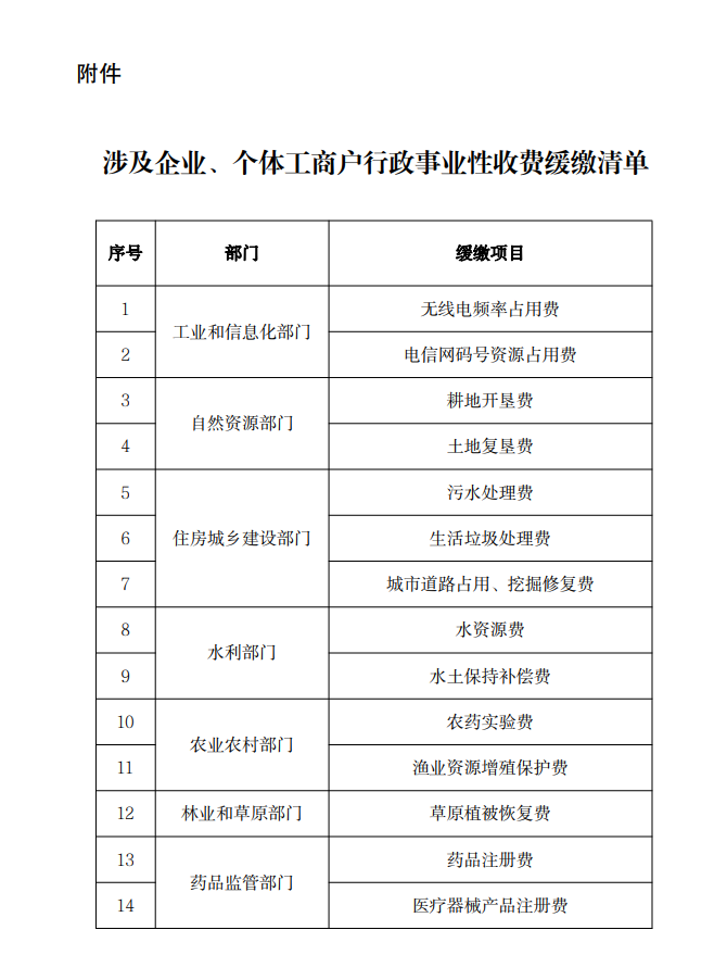 二、《涉及企业、个体工商户行政事业性收费缓缴清单》包括耕地开垦费、污水处理费等14项收费(具体项目见附件)。