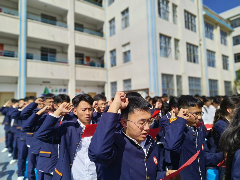 随后举行了庄重的揭牌授旗仪式。阿文东校长向高三年级郑重授予“高三战旗”,鲜红的战旗指明了奋斗的方向,凝聚了必胜的信念。教师代表随后登台演讲,他以高考作文关键词“梦”为引,激励学生们既要胸怀梦想,更要有脚踏实地的追梦行动,并代表全体高三教师庄严承诺:“全程护航,倾力相助”,做学生们最坚实的后盾。示范班学生代表发表了激情澎湃的演说,并带领全体高三学子高举右拳,以青春的名义庄严宣誓。铿锵有力的誓言响彻云霄:“争分秒砺剑三年,战六月金榜题名!”