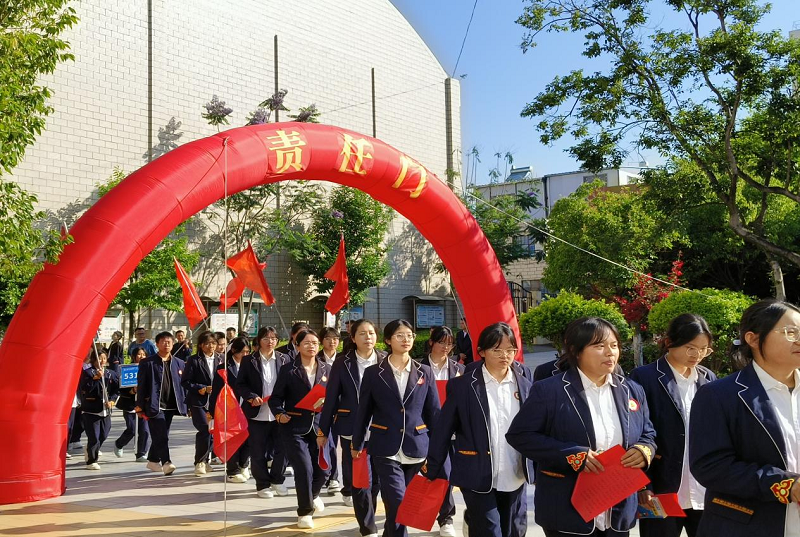 仪式在激昂雄壮的鼓点中拉开帷幕。由体育班学子组成的红旗方阵与6名鼓手分列两侧,以饱满的精神姿态迎接高三年级各班学子。同学们意气风发,依次穿越象征着担当与使命的“责任门”。迎风招展的鲜红旗帜与铿锵有力的隆隆鼓声交织,为学子们铺就了一条象征荣耀与拼搏的奋进之路。