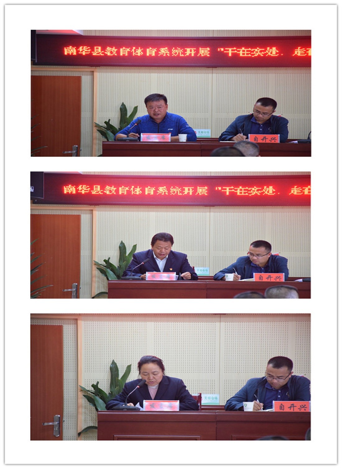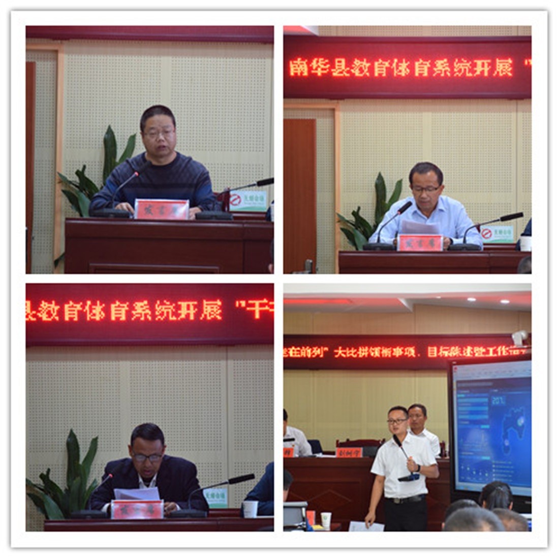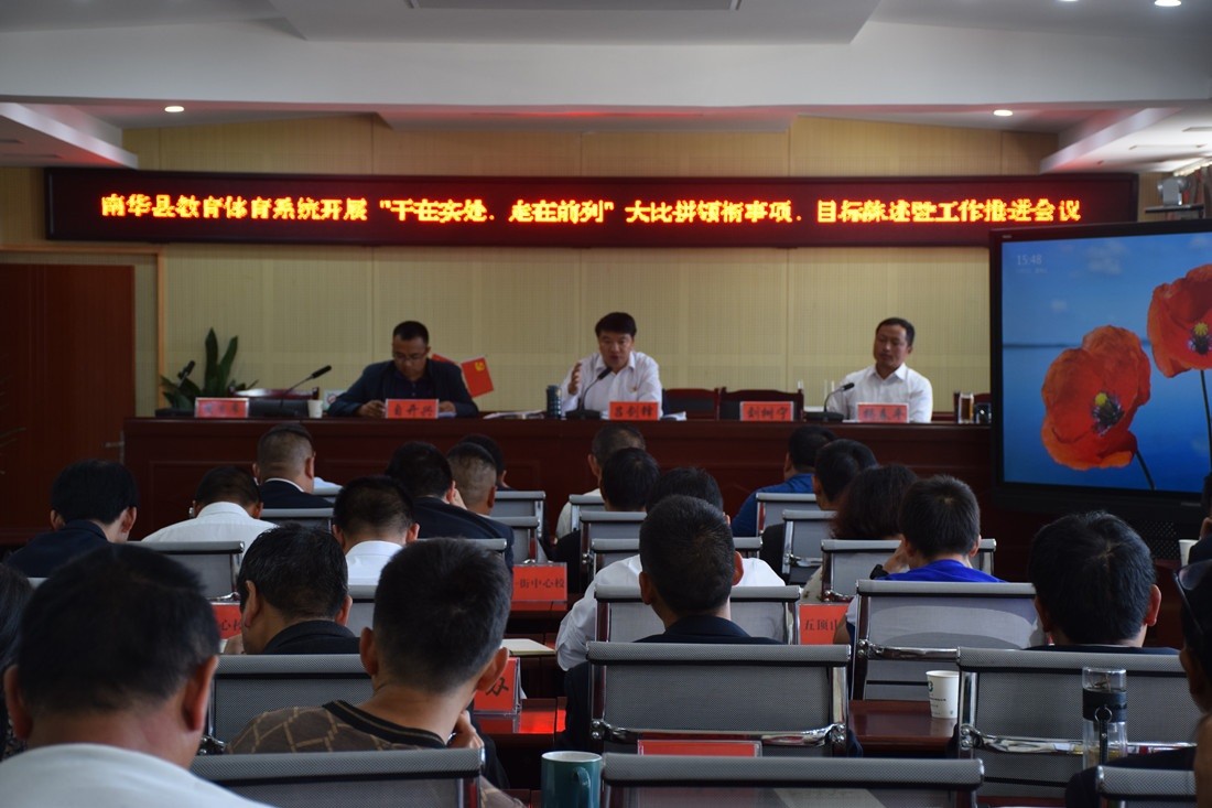 2019年11月1日下午,南华县教育体育局召开“干在实处,走在前列”大比拼领衔事项、目标陈述暨推进会议。县教育体育局班子成员、局机关各股室长(负责人)、各学校校(园)长、大比拼办工作人员共60余人参加会议。