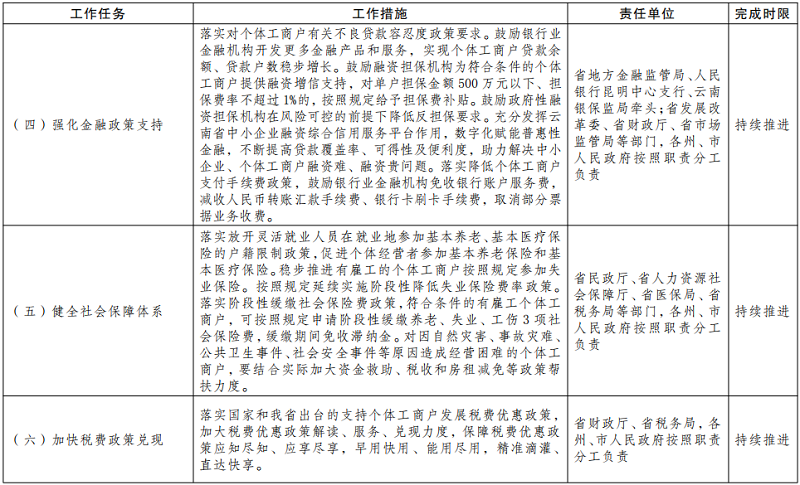 (六)强化金融政策支持。落实对个体工商户有关不良贷款容忍度政策要求。鼓励银行业金融机构开发更多金融产品和服务,实现个体工商户贷款余额、贷款户数稳步增长。鼓励融资担保机构为符合条件的个体工商户提供融资增信支持,对单户担保金额500万元以下、担保费率不超过1%的,按照规定给予担保费补贴。鼓励政府性融资担保机构在风险可控的前提下降低反担保要求。充分发挥云南省中小企业融资综合信用服务平台作用,数字化赋能普惠性金融,不断提高贷款覆盖率、可得性及便利度,助力解决中小企业、个体工商户融资难、融资贵问题。落实降低个体工商户支付手续费政策,鼓励银行业金融机构免收银行账户服务费,减收人民币转账汇款手续费、银行卡刷卡手续费,取消部分票据业务收费。