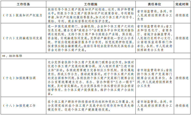 (十一)提供集成高效服务。依托国家个体工商户公共服务平台,整合优化资源,在“云南市场监管网上办事大厅”建立个体工商户公共服务专区,强化政策宣传、创业培训、招工对接、市场信息、金融支持等“一站式”服务。推广使用省中小企业公共法律服务线上平台,为个体工商户提供在线智能法律服务。各级政府及其有关部门要进一步畅通个体工商户投诉维权路径,完善问题转办和跟踪督办机制,及时回应合理诉求。