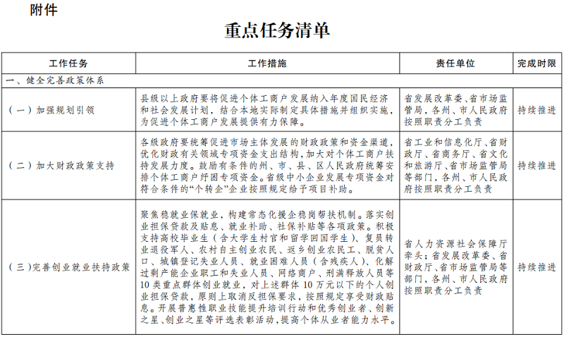 (十九)加强统筹协调。充分发挥省扶持个体工商户发展部门联席会议作用,加强对促进个体工商户发展的统筹协调,深入组织开展“三进市场主体”活动。各级政府要建立完善相应工作机制,落实属地责任,形成工作合力,推动政策落实。对于个体工商户反映的突出困难和问题,各级扶持个体工商户发展部门联席会议办公室要统筹建立交办、承办、督办和销号“三办一销号”制度,及时督促解决。充分发挥各级个体私营经济协会桥梁纽带作用,为个体工商户提供服务,维护个体工商户合法权益。