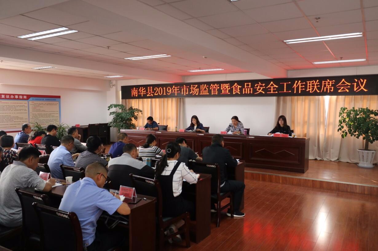 为进一步做好新时期市场监管工作,强化食品药品安全监管,更好服务全县经济社会高质量跨越发展。4月28日上午,南华县召开2019年全县市场监管暨食品安全工作联席会议。县食安委成员单位分管领导、10个乡镇分管领导和食安办工作人员、县市场监督管理局中层以上干部共70余人参加会议。