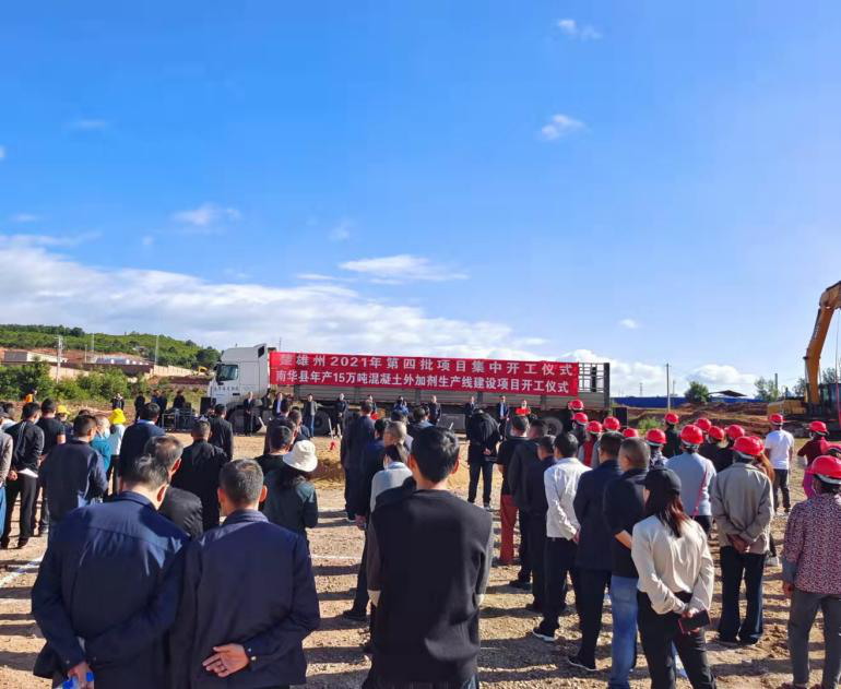 10月19日上午,南华县2021年第四批项目集中开工仪式在老高坝工业园区年产15万吨混凝土外加剂生产线建设项目施工现场举行。
