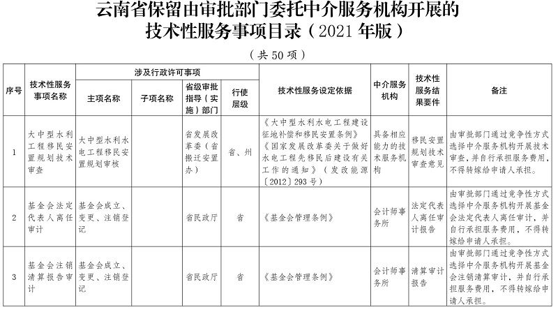 3.云南省保留由审批部门委托中介服务机构开展的技术性服务事项目录(2021年版)