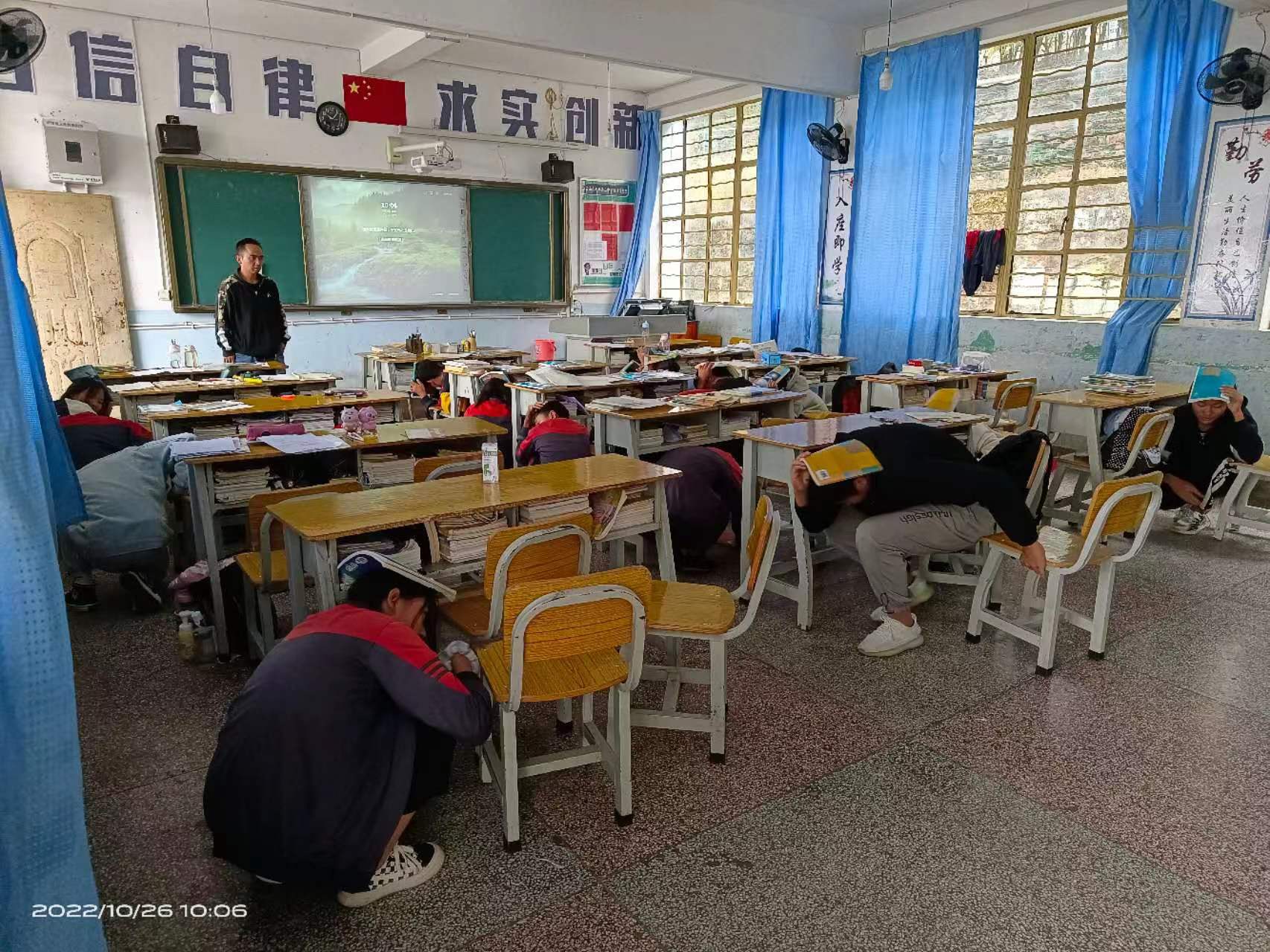 讲座结束后,分管学校安全的校领导吹响哨音,学校全体师生迅速开展避震和疏散,在较短时间内将全部师生安全有序撤离至预先指定的安全集合点。县地震局对演练分别作了点评。